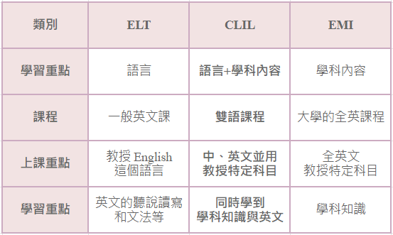 最右邊則是許多大學使用的 EMI (English Medium Instruction),用全英文進行某些科目的上課,非母語學生可能會在上課過程中,加減學到英文,但這不是課程的重點。EMI課程的主要重心是 「學科內容」的知識傳遞。
